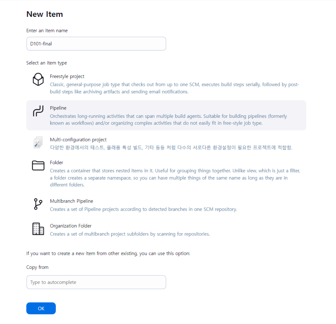 | Pipeline 방식 | 1. 파이프라인은 코드로 프로젝트 설정을 할수 있어 프리스타일과 다르게 젠킨스 웹에 직접 접근없이 변경 가능(물론 웹을 통한 변경도 가능!) 2. CI/CD 파이프라인 설정을 하나의 스크립트 파일(Jenkinsfile)을 통한 프로그래밍 제어 및 흐름제어 가능! 3. 버전 관리 가능! 4. GUI를 통한 과정 실행및 시간 확인 가능! |